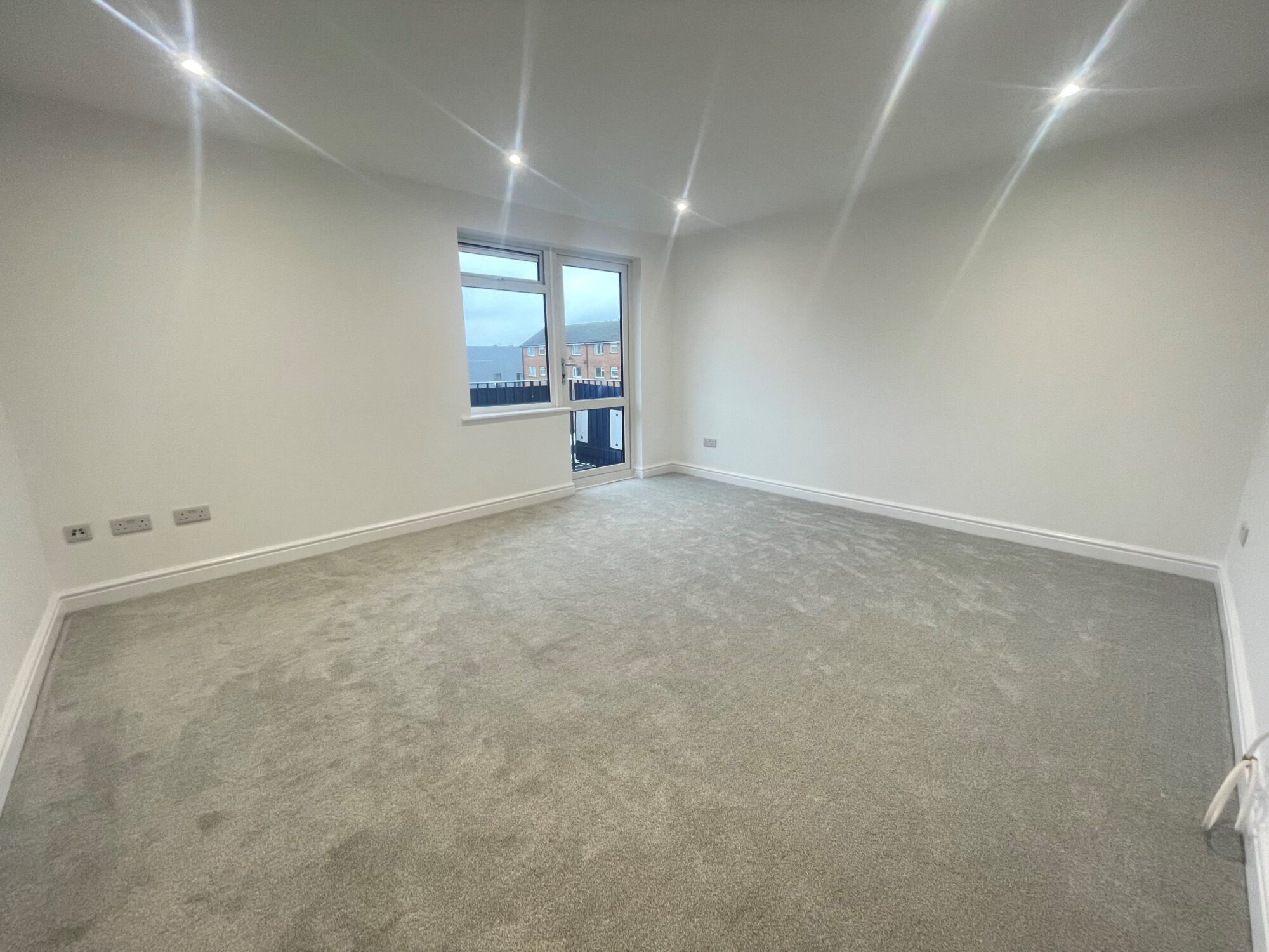The accommodation includes an entrance hallway, leading to a large living room with doors to a balcony, two double bedrooms, a newly fitted bathroom with shower over bath, and a fully fitted kitchen with white goods.